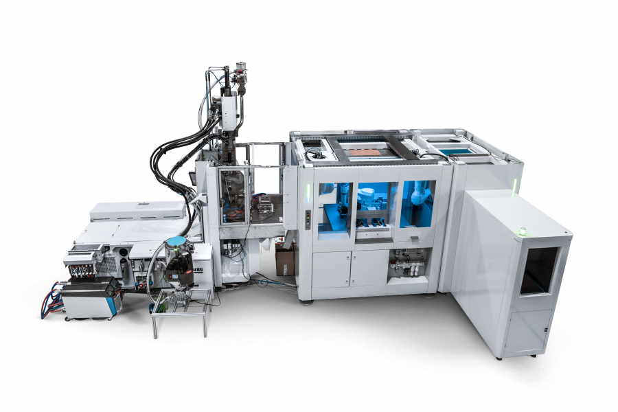 Ein automatisiertes Handlingsystem setzt präzise Bauteile in das Spritzgusswerkzeug ein und entnimmt die fertigen, umspritzten Teile. Die Zuführung der Komponenten erfolgt durch eine Kombination aus Roboter- und Fördertechnik. Nach der Formgebung werden die Teile auf ein Transfersystem übergeben und in einer Prozessstation weiterverarbeitet, wo unter anderem Reinigung, Montage und Qualitätskontrolle stattfinden. Anschließend übernimmt ein Roboter das Sortieren und Ablegen in Trays, die durch ein automatisches Stapel- und Entstapelsystem effizient gehandhabt werden. Diese Lösung ermöglicht einen langfristig autonomen Betrieb.