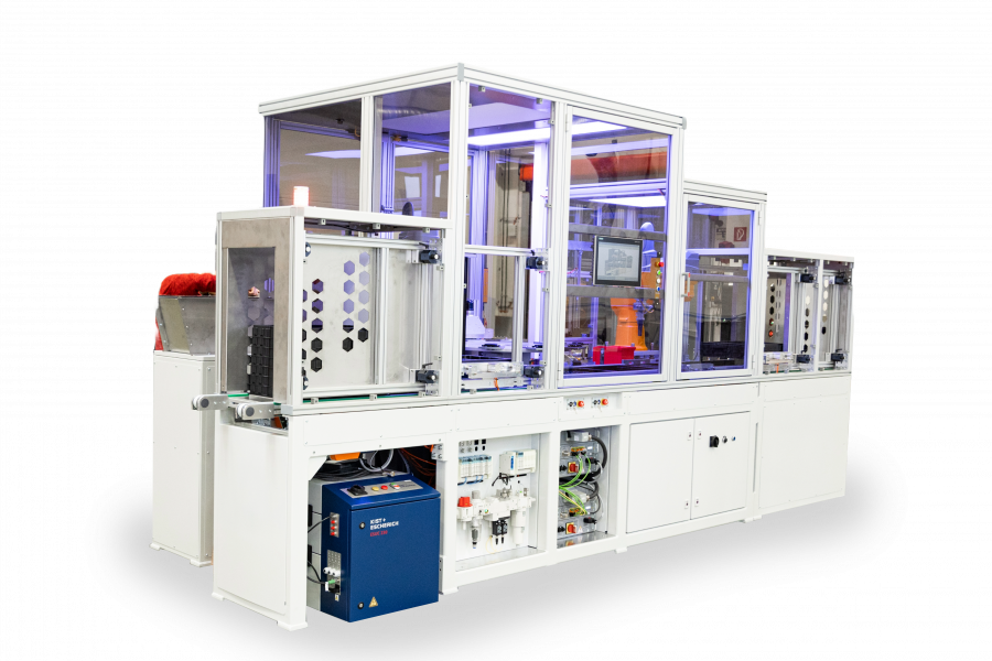Diese hochpräzise Montagelinie verbindet Effizienz und Qualität: Drei Einzelteile werden vollautomatisch zu einem fertigen Produkt zusammengesetzt, anschließend verschlossen, geprüft und sortiert. Drei Roboter übernehmen dabei alle Prozessschritte – vom Handling über die Montage bis hin zur Verpackung.